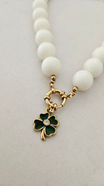 Prachtige ketting gemaakt van mooie grote kralen in creme met een geluksklaver.